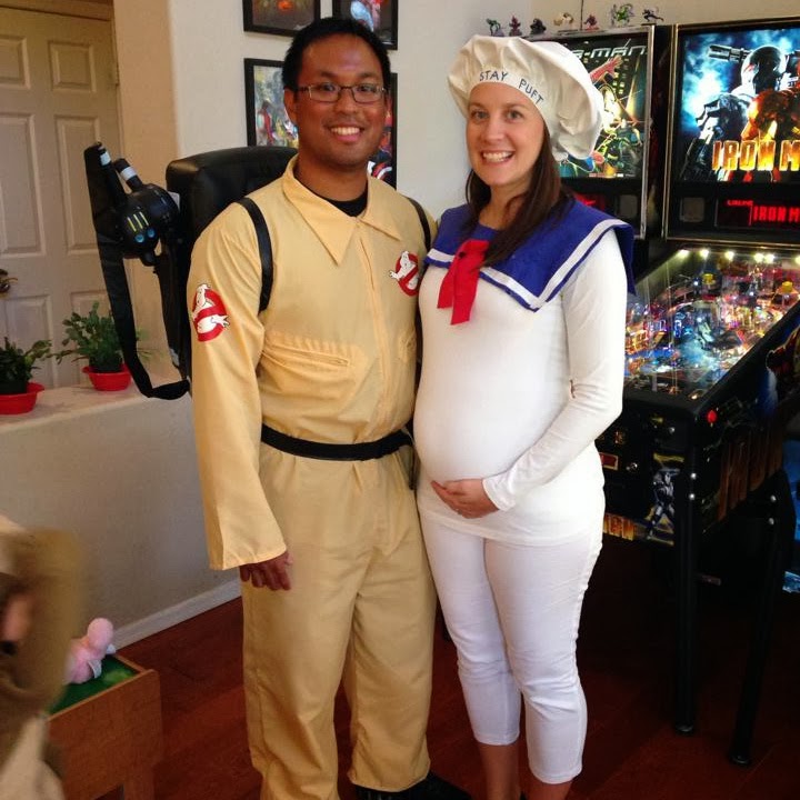 Drew went along as a Ghostbuster and the costumes went over very well! We even carved the Ghostbusters logo into our pumpkin. I had looked through a few maternity-inspired costumes online (bun in the oven, zombie babies, skeleton t-shirts complete with a skeleton of the fetus.) I wanted something that showcased the baby bump without creeping me out, so when Drew suggested a Ghostbuster and the marshmallow man as a joke, it quickly became a reality! We got a lot of compliments at his co-worker’s party from the sexy witches.