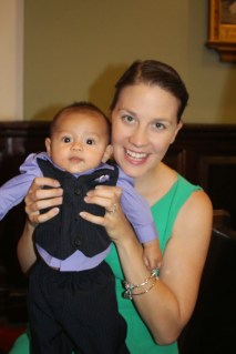 The wedding venue was beautiful. Stain glass windows, 20-foot ceilings, sleek wooden pews, and the echoes- you could hear a pin drop in that place a mile away. I bet a baby’s cry would resonate for days. I carried Baby B in his suit, and sat down to see the bride come down the aisle. It was to be a traditional Catholic service. We watched Drew and the rest of the groomsmen take their places along with the groom, listened to the music begin and enjoyed the processional. Being a former bride myself, I knew exactly what to do the second the priest started speaking. We snuck out the back. I wasn’t going to distract everyone with fidgeting and fussiness during an hour-long service. We played on the steps of the cathedral until just before the bride and groom were announced. We saw the best parts. Afterwards when guests complimented my baby for being so remarkably well-behaved, I smiled and nodded. Parenting win.