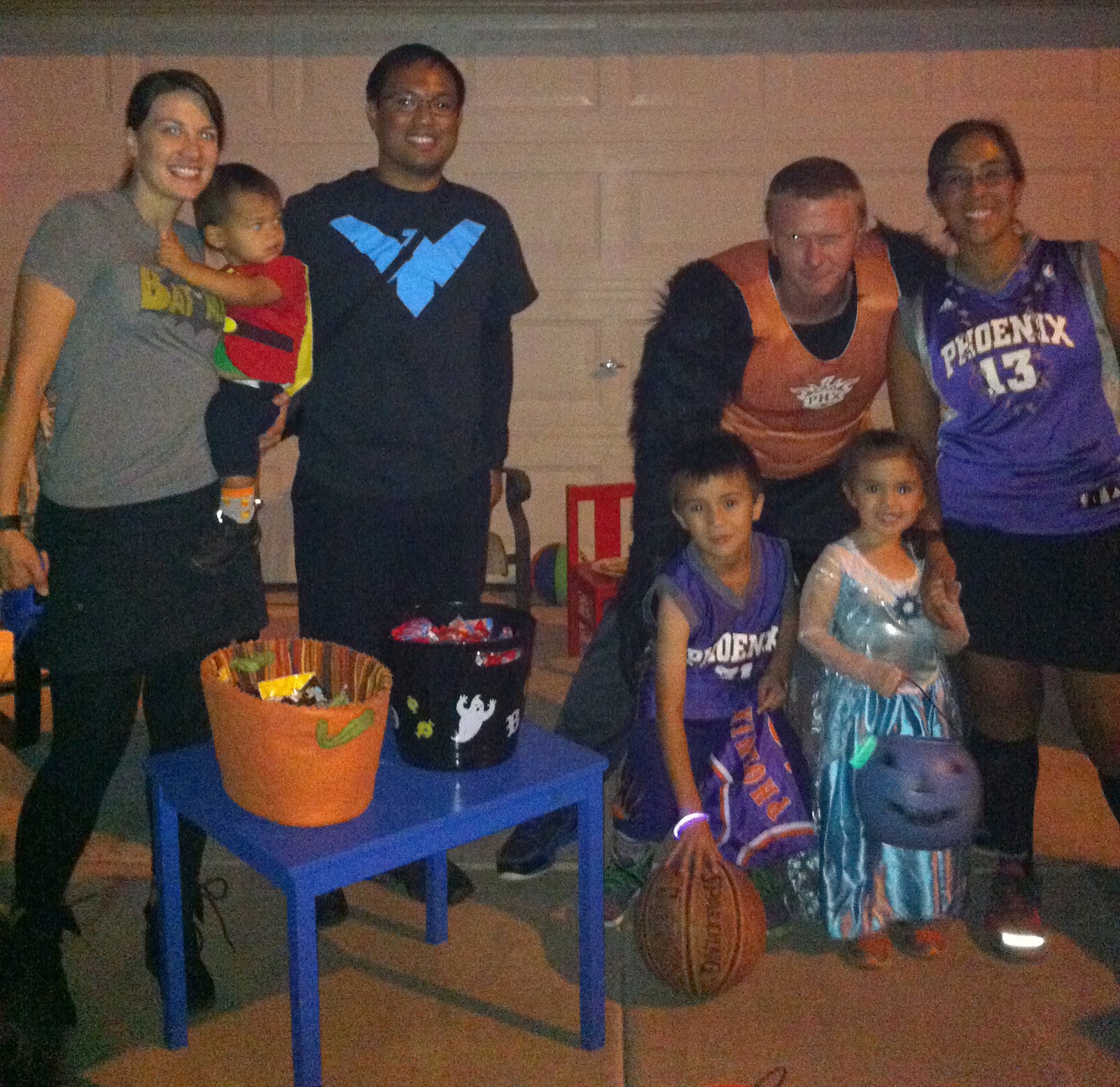 This month, Baby B (now Toddler B) added some new words to his ever-growing vocabulary- “Trick or treat please!” His first experience with trick-or-treating actually came the weekend before Halloween, when we attended a “Howl-O-Ween” event with friends. A portion of the zoo path was set up with doors and volunteers passing out candy to costumed children. B wore his Robin costume (I wore my batman t-shirt and his daddy was Nightwing, a reference left to the most devout of comic nerds,) and B caught on right away. As soon as he realized that his request resulted in candy, he sprinted to each door, yelling “Trick or treat please!” I ran behind, a nervous wreck that his full speed sprint would wind up in a candy-flung splatter on the pavement. Which it did at least once. Luckily, he gave a resounding, “I’m o.k” and continued on.