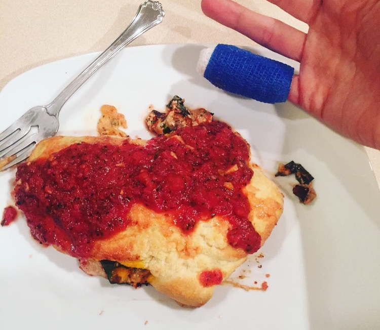 Blue Apron is a service that sends you recipes and all of the measured, fresh ingredients to make them. We got three meals for our first week and after making some pretty excellent salmon, I was confident that the Saturday before Easter would yield an even better calzone. I love cooking because we’re all in the kitchen together working on little pieces that come together as a whole. We get B to assist in simple tasks like stirring or ripping lettuce. On this particular night, I chopped all of the produce (successfully!) and was opening a can of crushed tomatoes when my pinky got caught in the lid and sliced right open.