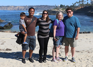 The California coast has been unseasonably warm lately, so while we were at La Jolla Beach, I let B take off his shoes and socks and put his feet in the water and splash around a bit. He was about shin-deep in the water with daddy and I was standing by the shore when all of the sudden he just started removing all of his clothes. ALL of them.