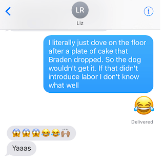 Then, a plastic plate hit the floor. It was the last piece of birthday cake, and without hesitating or thinking, I dove, nine months pregnant, to save a piece of cake from the dog like I was saving a child from oncoming traffic. I got up from the floor laughing hysterically at myself. Shortly after, I sent this text to my coworker: (pardon the autocorrect)