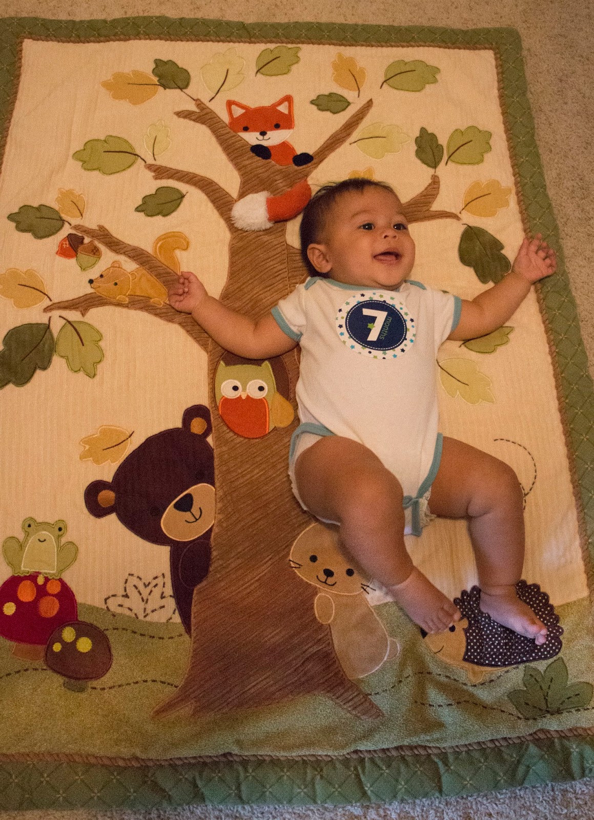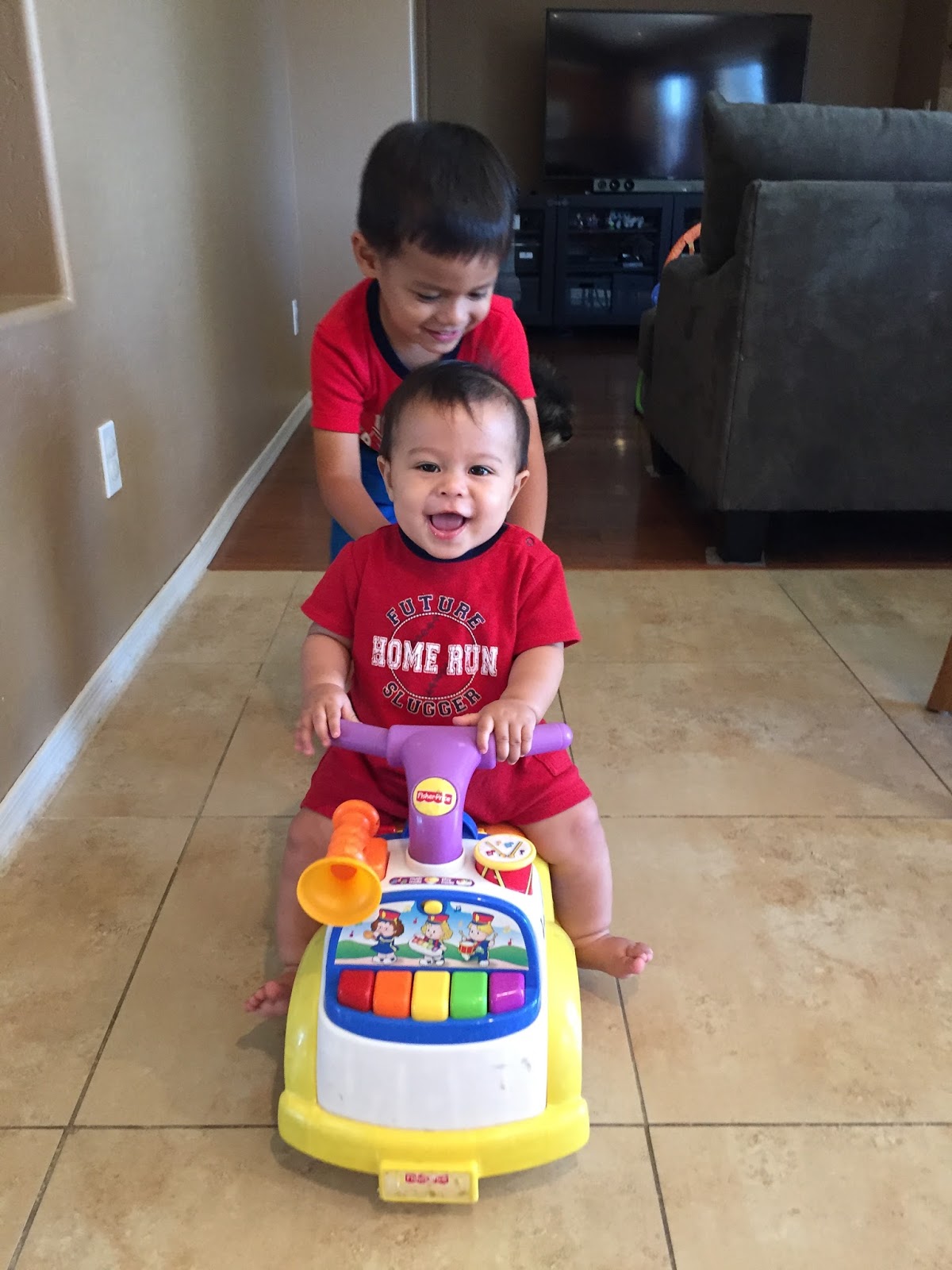 At 7 months, Baby Bro likes playing with his kuya, tasting new fruit, racing toy cars, pulling up to stand, scooting everywhere he wants to go, and being held by mommy.