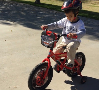 This Christmas, we got Big Bro his first two-wheeler. A “pedal bike” as he calls it. We were so excited to give it to him knowing how thrilled he’d be to have a Lightning McQueen bike, bright red with a carrying case for hot wheels cars attached to the handle bars. Christmas morning after his initial reaction he immediately started inspecting it. When he saw the case he exclaimed “I can take my cars to the park!”
