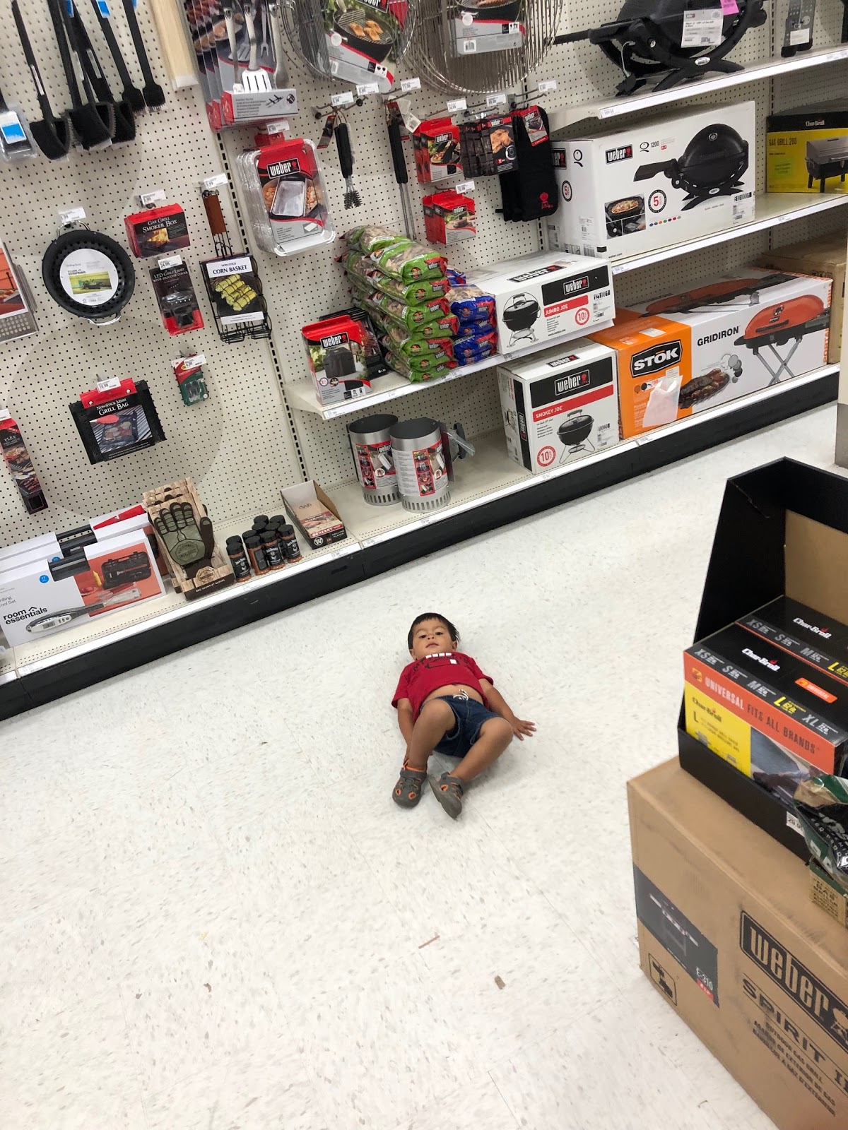This is my toddler in the middle of the floor at Target. He’s not even throwing a tantrum. No screaming, no kicking, he was cool and calculated as he bent down to the floor and rolled over to have a good rest. I turned around and saw him laying there. He was just done.