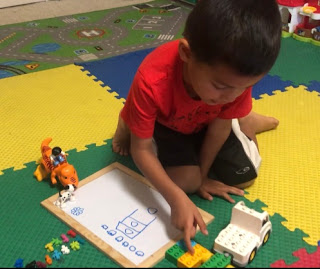 Afterwards, I did a few chores and he disappeared into the playroom. He re-emerged and grabbed my hand, leading me back to show me the “level” he’d created. I opened the playroom door and the entire floor was covered in meticulously placed Duplo blocks, cars, toy dinosaurs and more. It started on a white board where he’d drawn the entrance and buttons. There were trains, obstacles, secret compartments and bad guys. He could barely catch his breath as he explained each and every task, the premise, and the rules of the game. We played the real life level until his brother woke up. Then, we tried teaching him to play but he was more interested in pushing the trains. Or, as Big Bro phrased it, “totally ruining the game.”